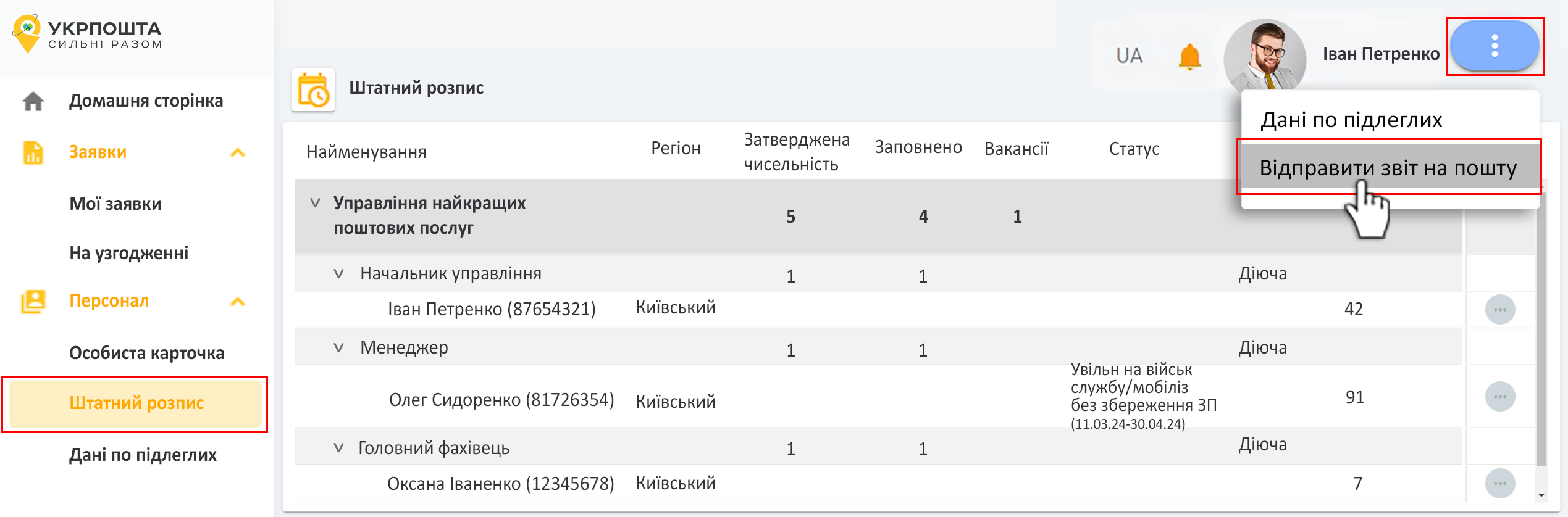 На вкладці «Штатний розпис» клікніть блакитну кнопку «Три крапки» вгорі праворуч. У випадному меню оберіть рядок «Відправити звіт на пошту».