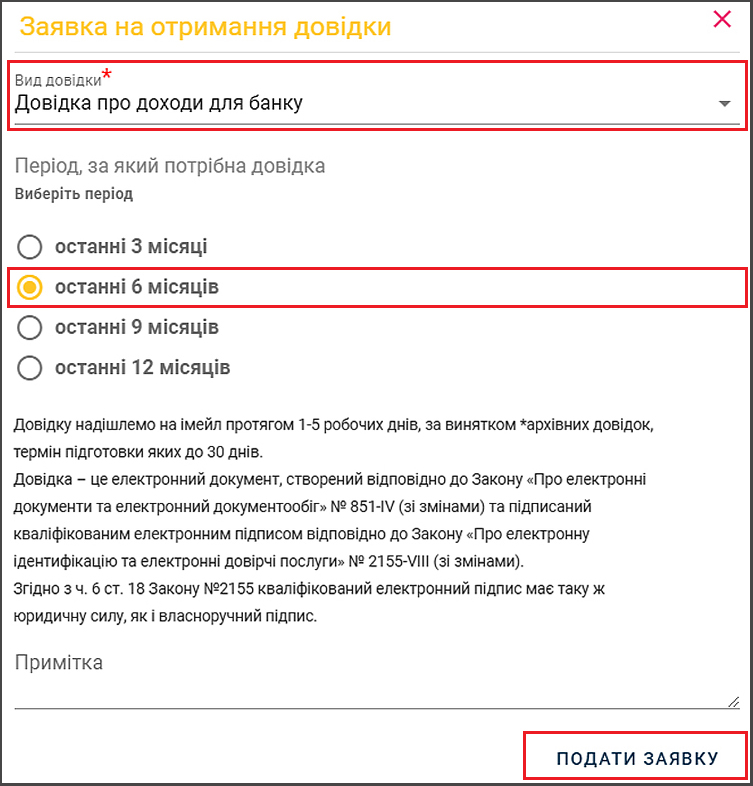 Відкриється окреме вікно. У верхньому полі оберіть із випадного списку потрібний вид документа. Зазначте період – дані за скільки місяців вам потрібні. Натисніть кнопку «Подати заявку».