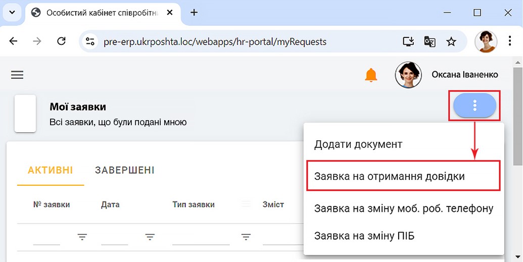 Як і в ситуації з відпустками, за довідками також більше не треба йти (писати / дзвонити) до вашого кадровика чи фахівця з розрахунків із працівниками. Зайдіть в Особистий кабінет / розділ «Мої заявки». Натисніть блакитну кнопку «Три крапки» вгорі праворуч та оберіть у випадному списку рядок «Заявка на отримання довідки».