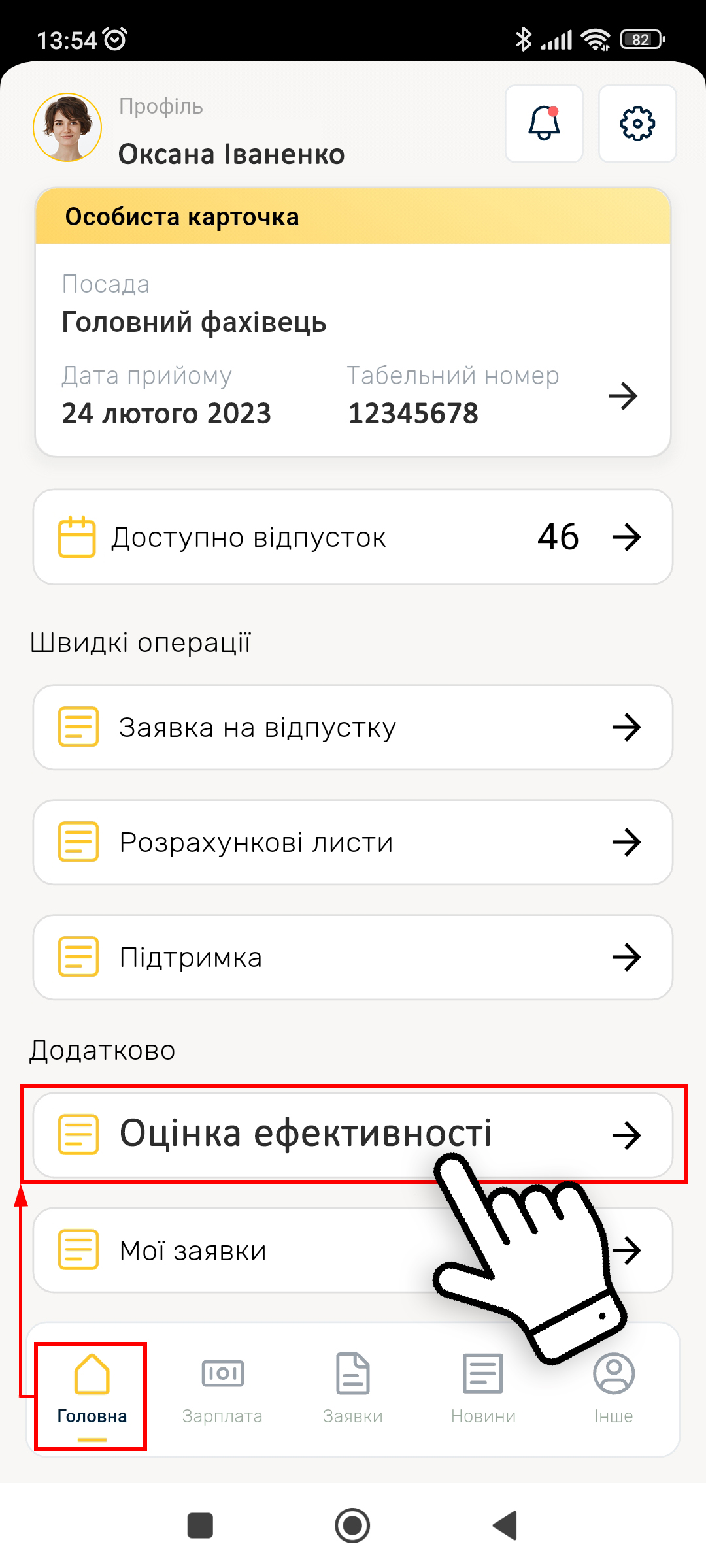 Давайте перевіримо, чи є ця новинка у вас. Відкрийте застосунок Персонал -> Головна -> Додатково -> Оцінка ефективності.
