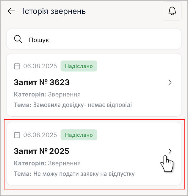 Кожне звернення – це окрема картка з інформацією про дату звернення, номер запиту й тему.